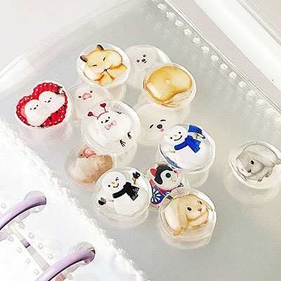 ベースシールにお好きなレジンクラブのシールを貼り、高粘度レジンをのせて硬化することで、ぷっくりとした仕上がりが楽しめます。
